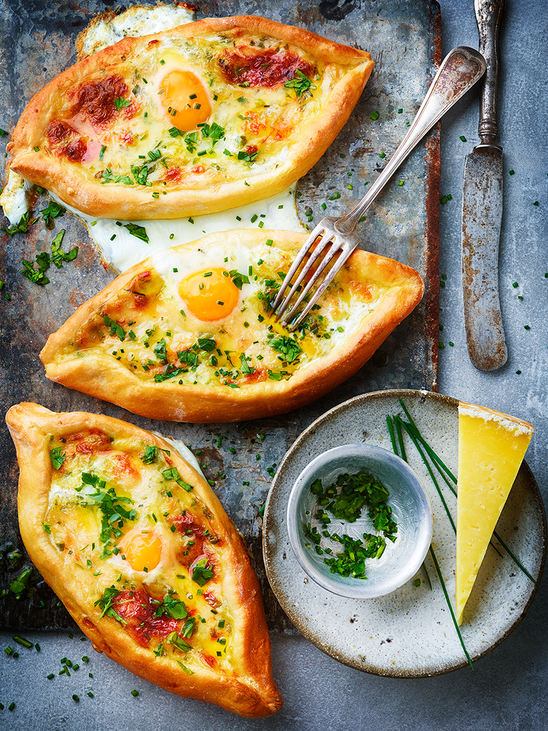 ③• Préchauffez le four à 250°C (Th.8-9). Divisez la pâte en 6 morceaux, étalez-les en forme ovale de 10 x 20 cm environ, mettez-les sur 2 plaques à four recouvertes de papier cuisson et laissez reposer 15 min. Garnissez de farce, rabattez les bords de pâte pour former des barquettes, badigeonnez la pâte avec 1 œuf battu et mettez au four en le baissant à 180°C (Th.6) pour 10 min. de cuisson.