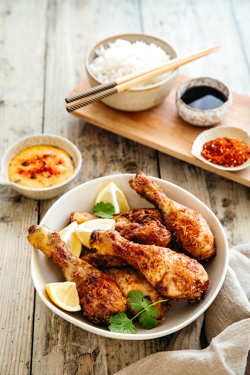 ⑦• Égoutter les pilons et les passer dans la fécule de maïs sur toutes les faces.