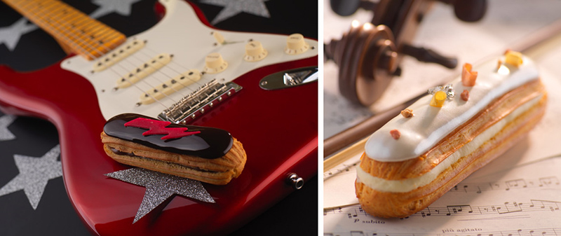 Le Concerto : une harmonie de goûts s’opère grâce à une délicieuse mousse à la vanille parfumée à la fleur d’oranger, renfermant un cœur à la poire, sur un croquant au chocolat blanc décoré d’un glaçage scintillant.