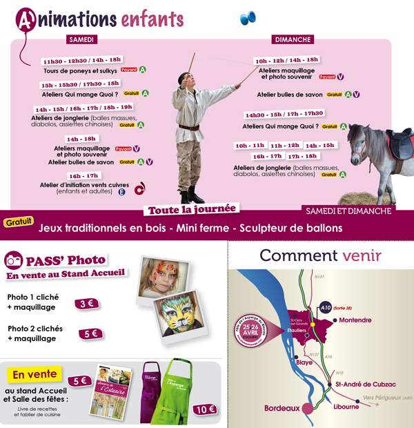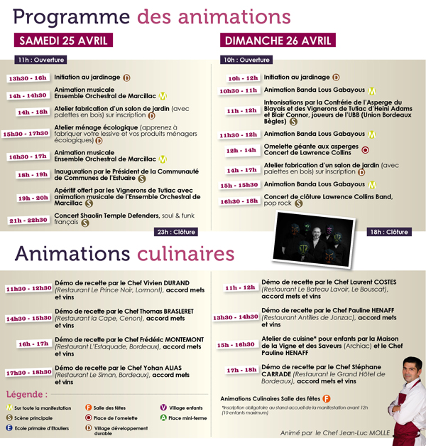 « Comme tous les ans et dans tous les agendas de Haute-Gironde, le dernier weekend d’Avril est réservé à l’événement le plus botté de l’année : la Fête de l’Asperge du Blayais à Etauliers. Les plus de 10 000 visiteurs déambuleront librement et gratuitement parmi une soixantaine d’exposants aux délices régionaux ; les enfants jongleront entre des promenades en poney, des séances de maquillage et la découverte d’une mini-ferme.