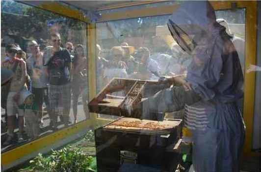 • Ouverture d’une ruche par un apiculteur dans l’Apimobile (véritable ruche vitrée)
