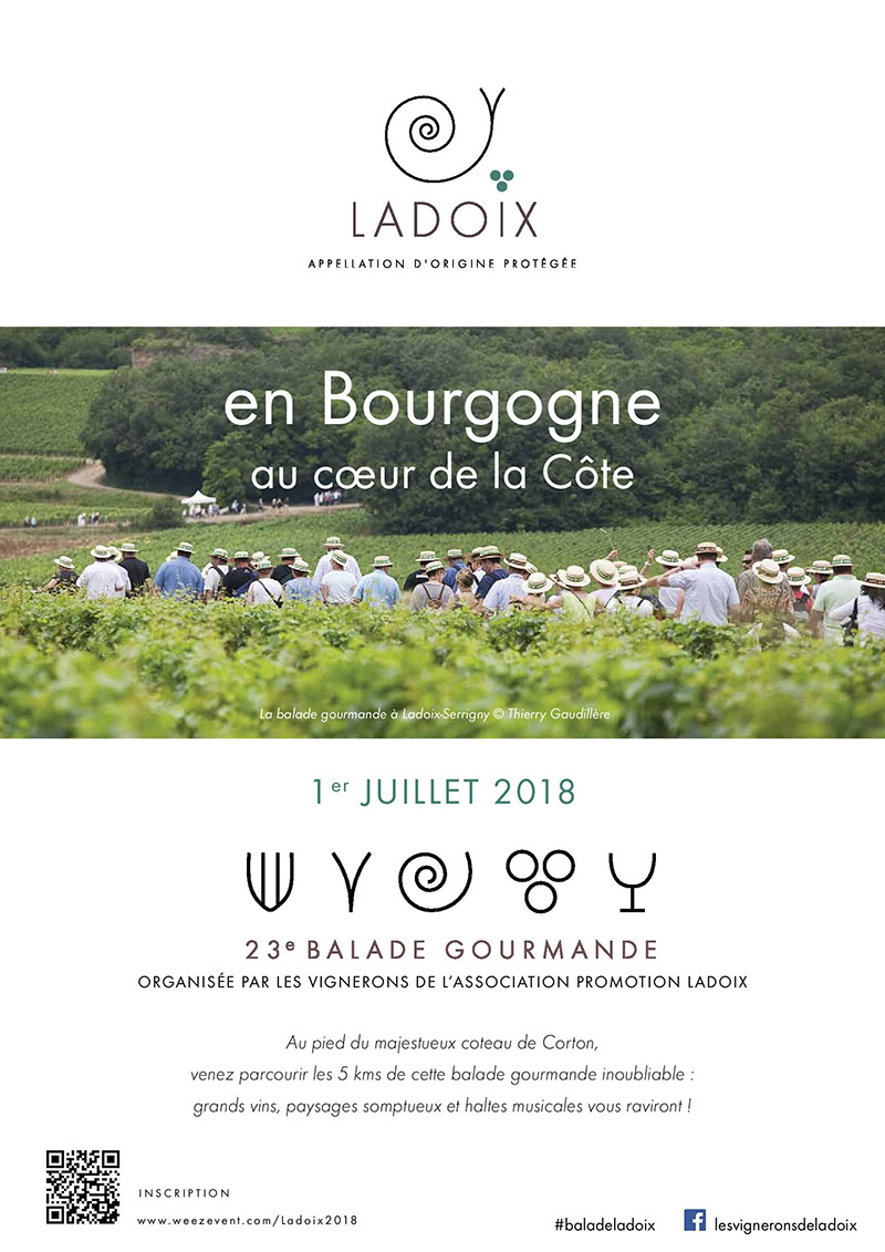 Première balade gourmande française à avoir vu le jour elle permet aux participants un véritable tour d'horizon des grands vins de Bourgogne : Ladoix & Ladoix 1er Corton grand cru, Bourgogne aligoté et Crémant. Longue de 5 km, la balade est ponctuée de 5 étapes gourmandes autour d'accords mets et vins locaux, à déguster en famille ou entre amis.