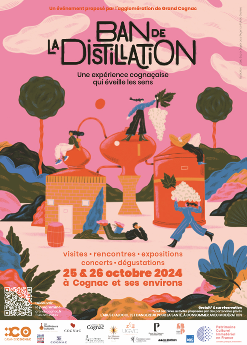 Les appellations Cognac et Pineau des Charentes apportent leur soutien plein et entier aux équipes de GRAND COGNAC pour l’organisation de cette seconde édition du Ban de la distillation. La distillation est une étape importante et spécifique dans leur élaboration et pendant quelques semaines cruciales, elle mobilisera des centaines d’hommes et de femmes pour changer le vin en eau-de-vie délicate. Ainsi, le Bureau National Interprofessionnel du Cognac (BNIC), l’Union Général des Viticulteurs pour l’AOC Cognac (UGVC), le Syndicat des Maisons de Cognac (SMC), le Syndicat des bouilleurs de profession, ainsi que le Comité National du Pineau des Charentes se sont unis et mobilisés pour proposer différents moments d’échange et de découverte autour des savoir-faire et des produits : dégustations, initiation à la mixologie, découverte de l’ADN du Cognac ou encore projection de documentaire, vous serez alors invités à parfaire vos connaissance ou vivre de nouvelles expériences « à la carte ».
