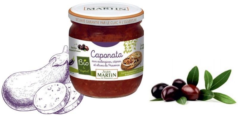 La Caponata est réalisée à partir d’aubergines cuisinées au vinaigre de cidre et relevées de câpres et d’olives noires Grossane de Provence.