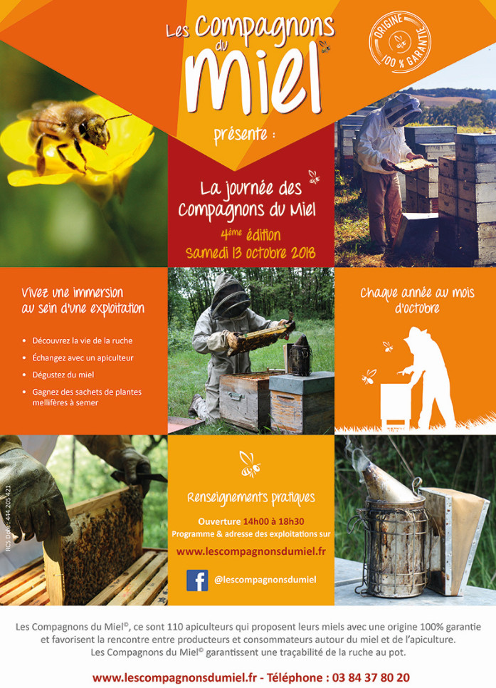 Après le succès de la dernière édition en octobre 2017, Les Compagnons du Miel organisent une nouvelle fois, le samedi 13 octobre prochain la quatrième journée des Compagnons du Miel : un rendez-vous annuel pour rencontrer des apiculteurs et découvrir leur travail au sein de leur exploitation, échanger avec eux, déguster du miel de nos territoires, s’informer et participer à la sauvegarde des abeilles et de la biodiversité.