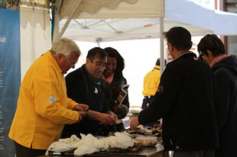 Stand de démonstration de la technique de décoquillage par des professionnels de la baie de St-Brieuc.