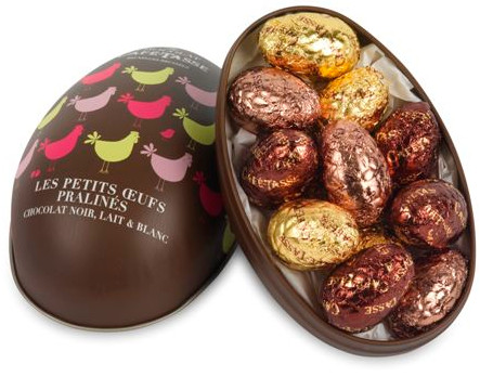 Dans cet œuf métallique se cache un assortiment de petits œufs pralinés au chocolat noir, lait et blanc.