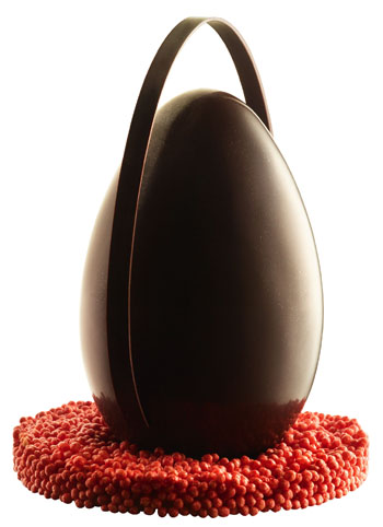 Le maestro du chocolat Pierre Marcolini propose un œuf à anse au chocolat noir disposé sur un socle en nougatine.