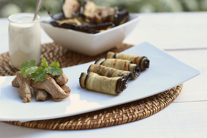⑥• Roulez les aubergines et déposez-les sur une assiette puis déposer les lamelles de veau. Versez un filet d’huile d’olive citronnée sur la viande.