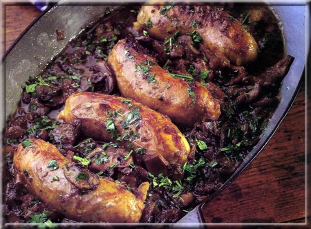2.Le Lendemain : Chauffer 50 g. de beurre dans une grande poêle, y blondir les échalotes et l'ail 3 à 4 min . Ajouter les champignons, blondir le tout 5 min. Verser le mélange dans un plat à four. Y enfouir les andouillettes, mouiller avec la marinade.