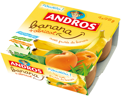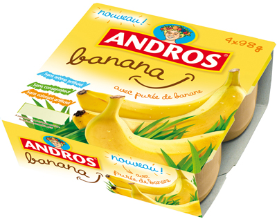 Andros Banana, une nouvelle génération de Desserts Fruitiers®, exclusivement à base de purée de banane, qui allie authenticité et vitalité, bonne humeur et envie. Pour varier les plaisirs et proposer le meilleur du fruit, Andros a imaginé une recette unique, sans pomme qui concentre les bienfaits et l’énergie positive de la banane, le fruit préféré des enfants !