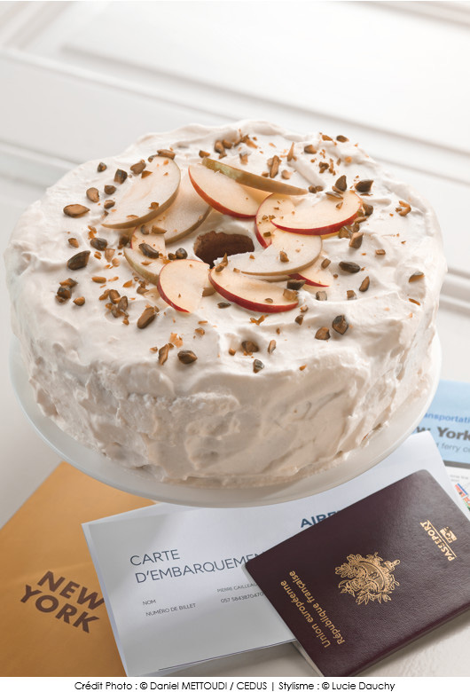 -Fouetter la crème fleurette bien froide, incorporer le sucre glace et fouetter jusqu’à obtention d’une chantilly. Napper le gâteau de chantilly à l’aide d’une spatule. Réserver au frais avant de servir, éventuellement décoré de lamelles de pomme fraîche.