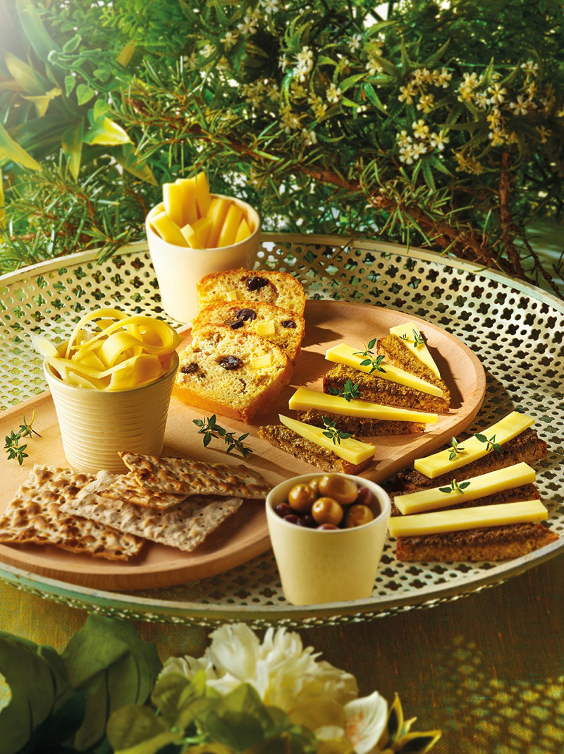 Sur une grande assiette de service ou sur une belle planche en bois, placer le Beaufort AOP râpé. Arranger autour les toasts tapenade/Beaufort AOP, quelques tranches de cake, les olives vertes, les olives noires, les crackers apéritif, et les batônnets de Beaufort.