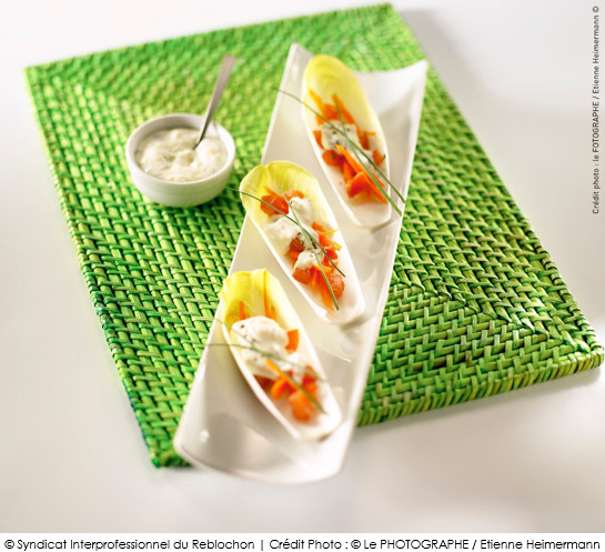 Assaisonner les barquettes d’endives avec la sauce au reblochon.