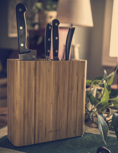 Pour une cuisine 100 % nature, le coutelier espagnol propose son bloc de couteaux en bois de bambou. Son système interne de fibres lui permet d’accueillir tout type de couteaux.
