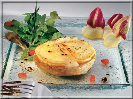2.Mélanger la vinaigrette et le mesclun. Répartir dans quatre assiettes, placer dessus les artichauts au rocamadour.
