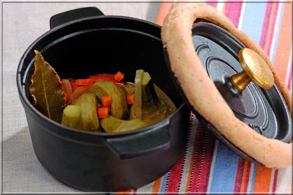 4- Préchauffer le four à 160°C (th.5/6), tapisser le fond d'une cocotte avec le jambon de pays. Ajouter le thym, le laurier et l'écorce d'orange blanchie. Poser les artichauts. Saler et poivrer.