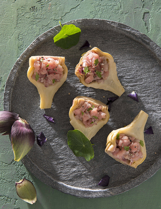 Taillez le veau en tartare, ajoutez une échalote traditionnelle ciselée, de la bonne huile d'olive et du sel puis farcir les artichauts.