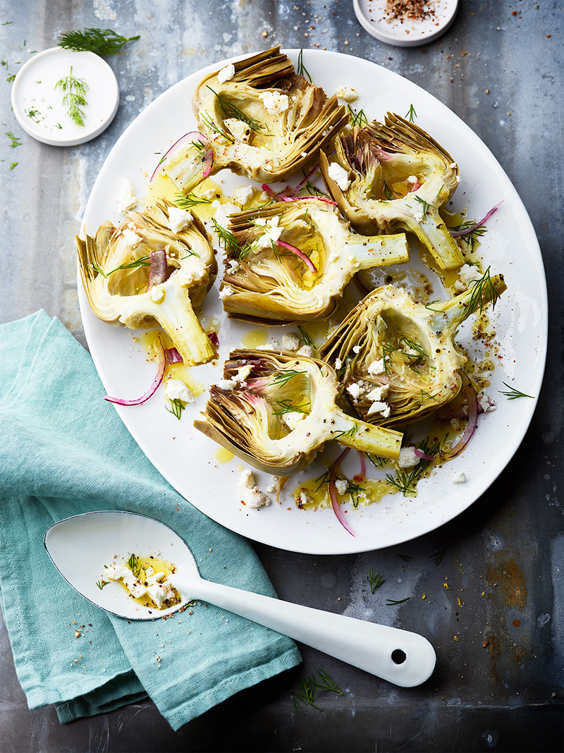 ③• Ouvrir la papillote et répartir les artichauts sur un plat de service. Parsemer de feta émiettée, d’aneth et d’oignon rouge émincé, et arroser avec le reste de l’huile d’olive.