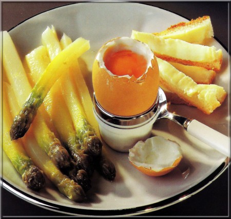 Servir asperges,œufs en coquetiers et baguette beurrée.