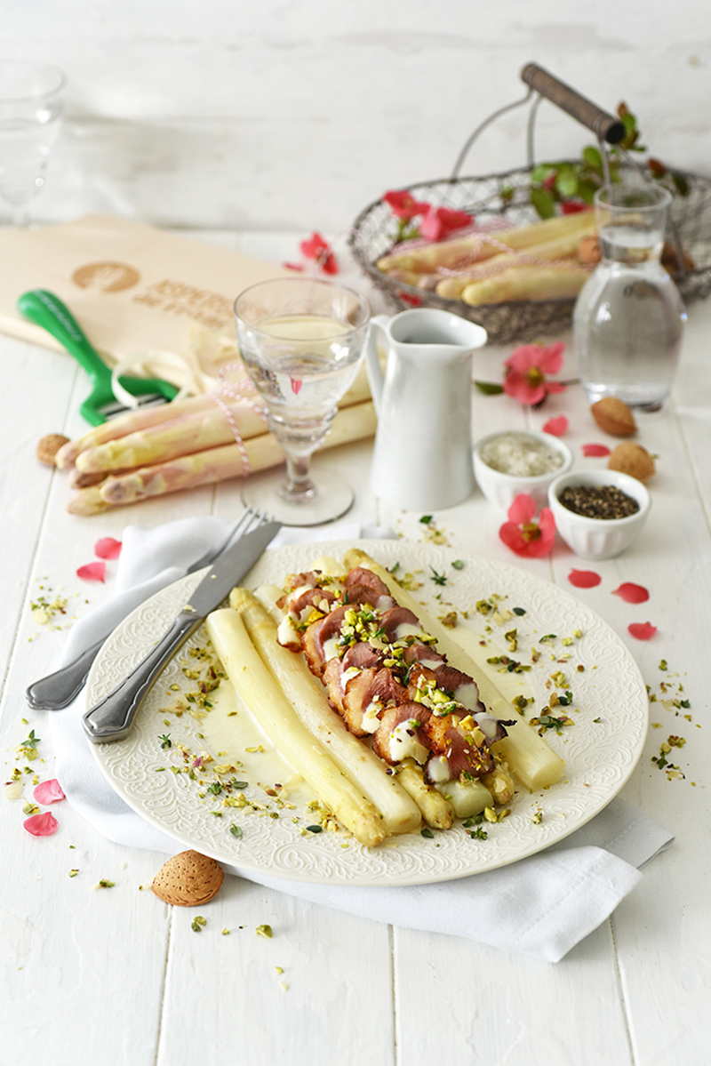 Asperges blanches et violettes au magret de canard saupoudré de pistaches et d’amandes
