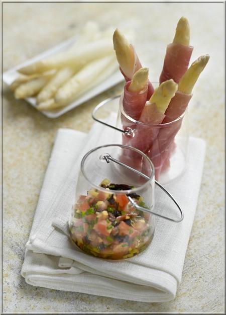 Pour une soirée plus décontractée, plateau-télé et vidéo, dressez les asperges enrobées de jambon dans des verres et répartissez la sauce vierge dans des petits bols.