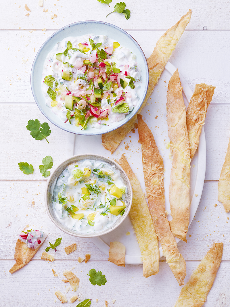 Servez les crackers avec les deux raïta.