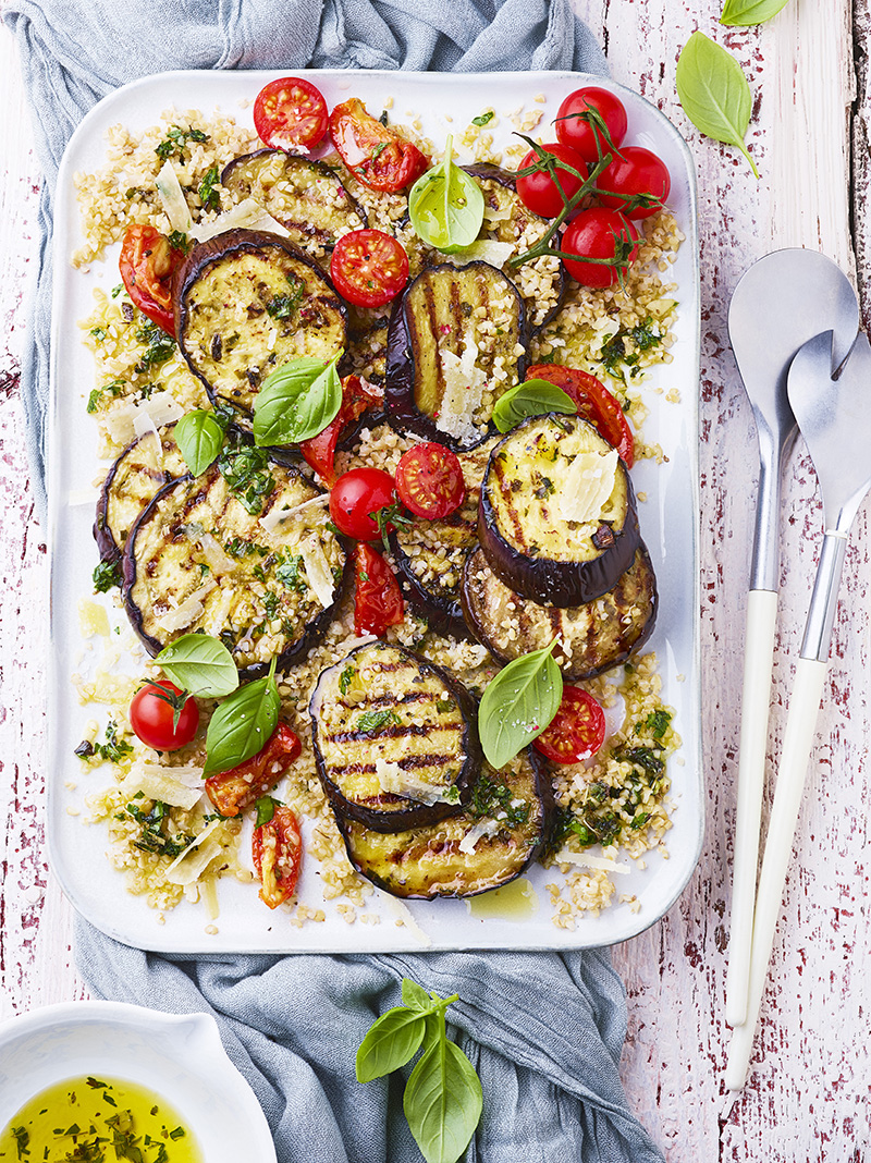 On dirait le sud ! Avec ces tranches d'aubergines grillées parfumées à l'ail et aux herbes de Provence, au tomates confites et à l'huile d'olive, et bien sûr du basilic !