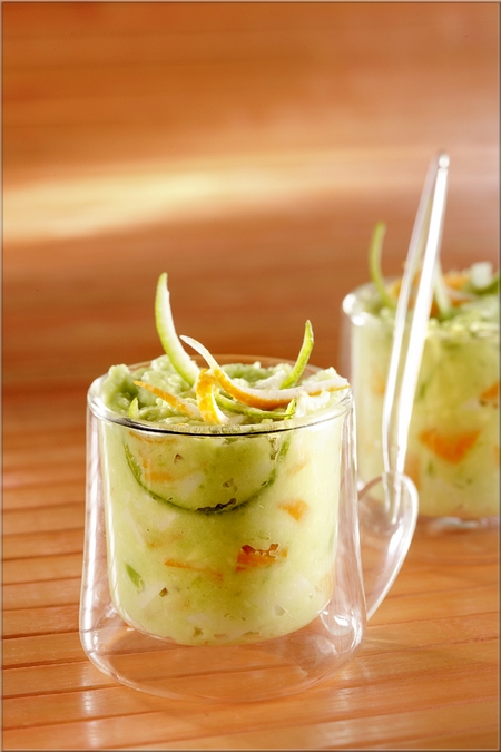 3• Ébouillanter le zeste de citron pendant 1 minute et le découper en lanières fines. Hacher le surimi. Mélanger le tout avec la purée d’avocat et répartir dans des petits ramequins.
