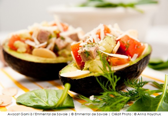 4• Dans les moitiés d’avocats, répartissez les œufs mayonnaise, des dés de tomates, de jambon et d’Emmental de Savoie. Parfumez avec un peu de basilic ciselé.