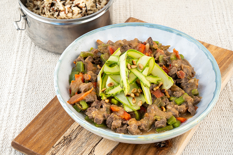 Dans une assiette creuse, mettre l’Axoa de bœuf. Recouvrir avec les tagliatelles d’asperges et parsemer de pignons de pin.