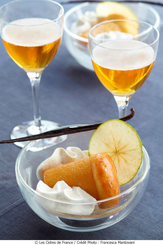 Servir la génoise imbibée de sirop au cidre, avec la crème aérienne à la vanille et une rondelle de pomme croustillante, avec un verre de cidre doux Les Vergers du Cotentin..*
