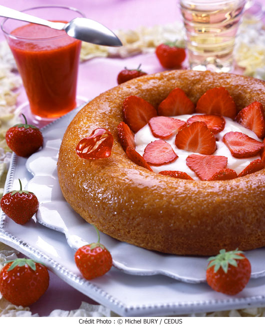 13• Disposer le baba sur un plat, verser la crème chantilly au centre et décorer avec les fraises réservées, coupées en lamelles.