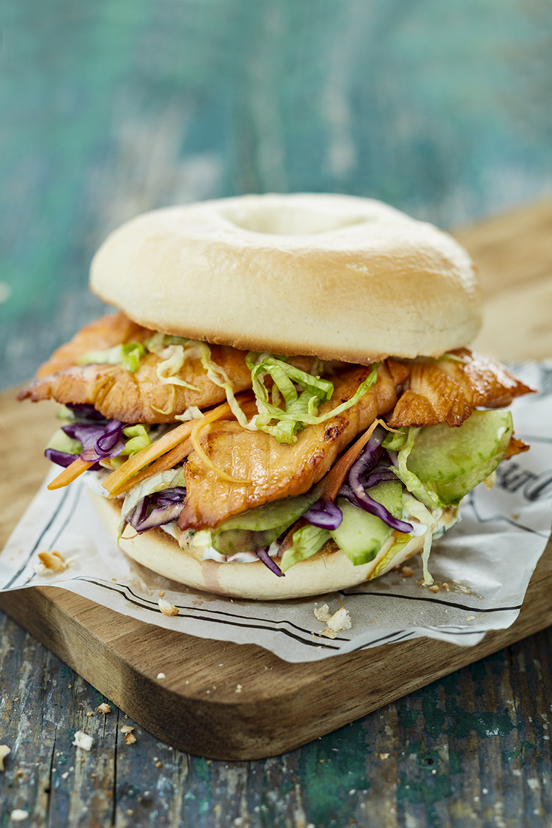 Un bagel gourmand, aux bons légumes croquants, et des escalopes de saumon poêlé à la sauce teriyaki. À déguster sur le pouce pour un vrai moment de fraîcheur !