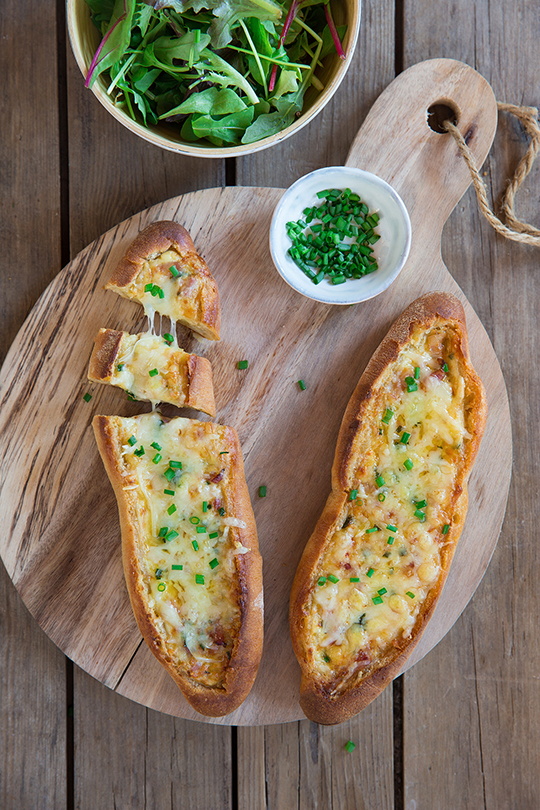 ④• Garnir la baguette avec l’appareil au râpé Le Saint Mont des Alpes Entremont.