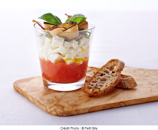 ③• Détailler Petit Billy en dés. Mettre au fond d’une verrine le concassé de tomates, les dés de Petit Billy, les feuilles de basilic hachées, une tombée d’huile d’olive.