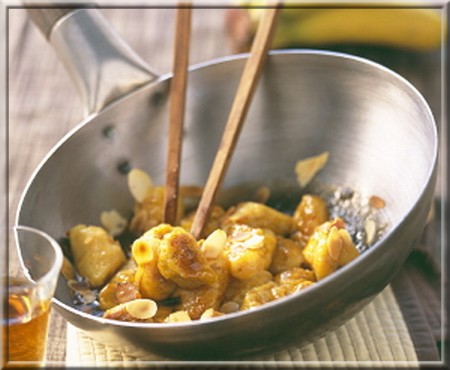 2.Faire chauffer l’huile et le beurre dans le wok (l’huile empêche le beurre de noircir), y faire revenir les bananes de tous côtés jusqu’à ce qu’elles soient tendres.
