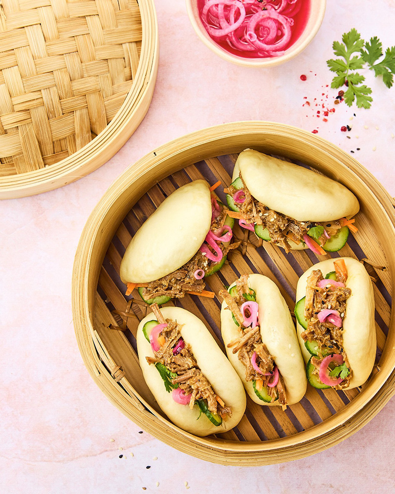 ⑨• Ouvrez délicatement les bao buns, garnissez-les de Pulled Pork, de pickles d’oignon rouge, de crudités, de coriandre.