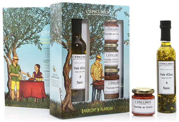 Le coffret dévoile 4 aides culinaires et tartinables indispensables pour cuisiner au barbecue ou à la plancha. Un déjeuner gorgé de soleil et de saveurs. Une marinade provençale pour parfumer la viande, une huile d’olive au Basilic pour griller pommes de terre, poissons et légumes… Et en attendant que les grillades dorent, la Piperade au Chorizo et la Concassée d’Olives Vertes Fenouil Citrons Confits se dégustent à l’apéro avec des petits gressins.