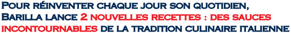 À la question « que vais‐je bien pouvoir manger aujourd’hui en 30 minutes ? », Barilla apporte finalement une réponse immédiate par une proposition innovante de repas clé en main, prêt en 90 secondes ! Barilla a conquis ses consommateurs en 2012 par une offre de plats préparés variés, savoureux et pratiques : Maccheroni alla Bolognese, Penne Pomodoro e Basilico, Fusilli alle Verdure, Penne all’Arrabbiata.