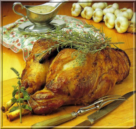 1-La veille,mélanger l'huile avec le thym et le romarin broyés,sel et poivre.En enduire le baron.Enfoncer quelques éclats d'ail sous la peau avec un couteau fin.Tenir au frais jusqu'au lendemain.