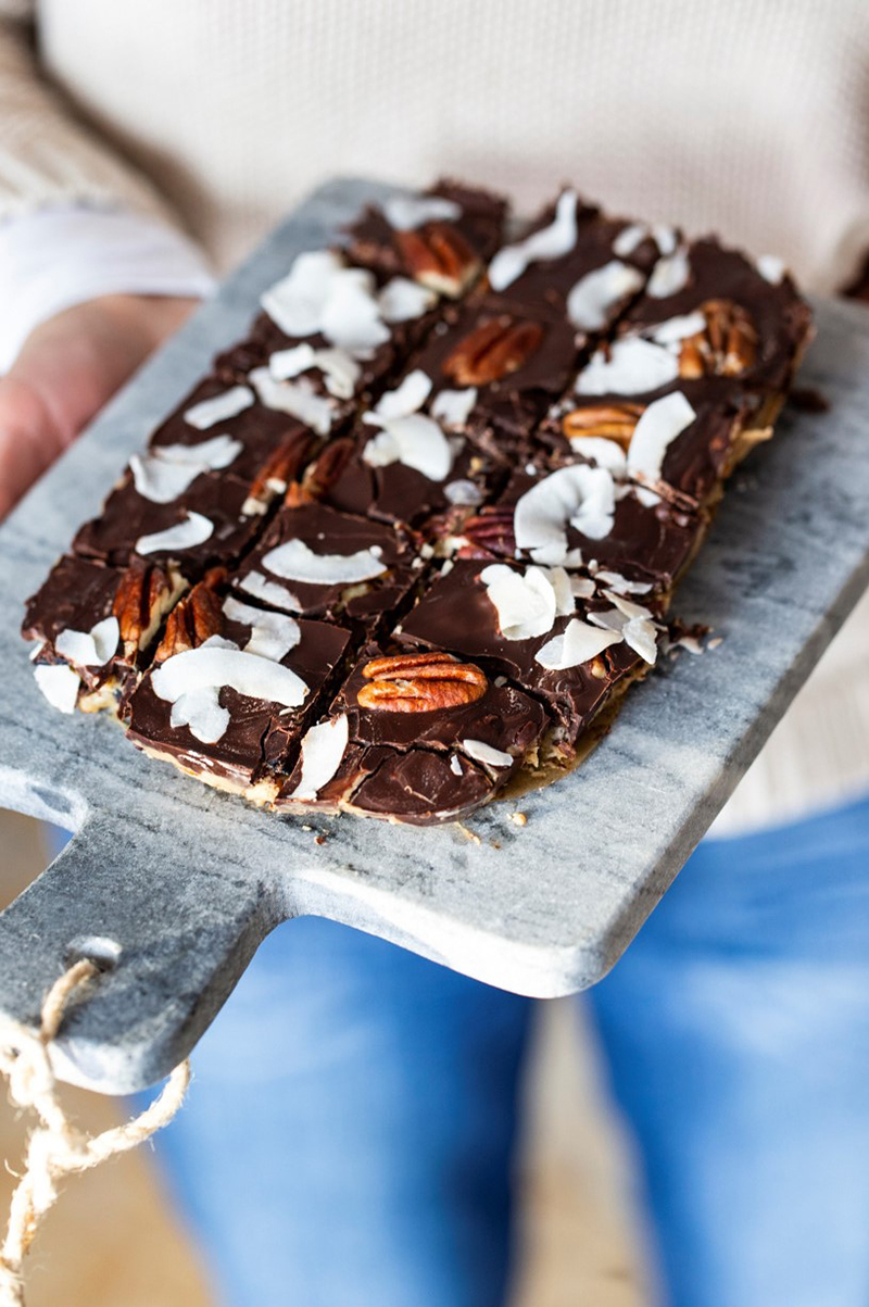 Barres de chocolat au riz soufflé, noix de pécan et coco