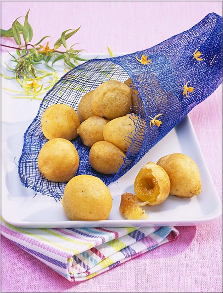 6• Plonger les mirabelles une à une dans la pâte, puis dans l’huile chaude, par fournées de 10 fruits environ. Retirer les piques en bois.