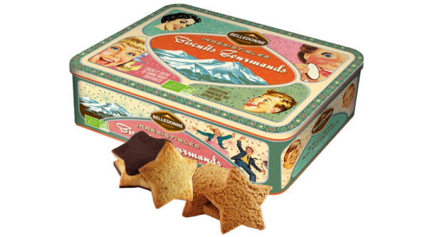Boîte de fabrication française avec un décor rétro comprenant 2 sachets de biscuits gourmands en forme d’étoile : biscuits à la cannelle et biscuits à l’orange nappés de chocolat noir.