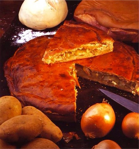 3.Garnissez la pâte avec des couches successives de pommes de terres, oignons et petits lardons, salez et poivrez entre chaque couche.