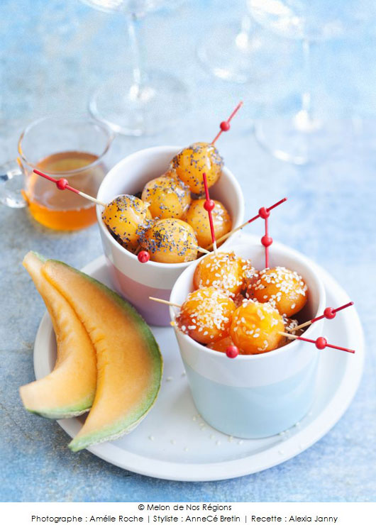 3• Piquer les billes de melon de nos régions sur des brochettes en bois, puis réserver.