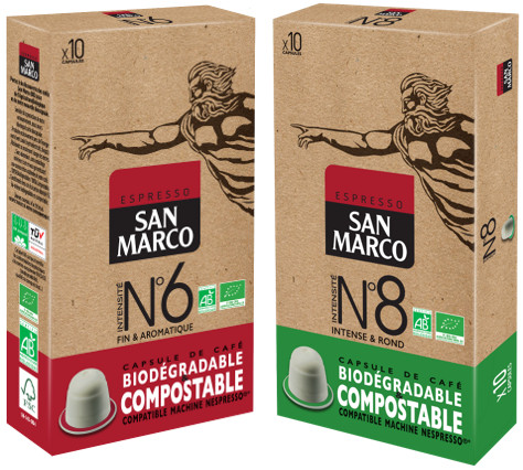 Cette année, San Marco lance BIOcaps, la toute première capsule compatible avec les machines Nespresso® à être entièrement écoconçue. Produite exclusivement à l’aide d’énergies vertes (vent, soleil, hydroélectricité et biogaz), elle se présente sans aluminium et même sans emballage individuel. Quant à son packaging, il est fabriqué à partir de carton et d’encre écoresponsables. Enfin, pour la recycler, il est conseillé de les mettre dans le bac de déchets organiques pour qu’elles soient collectées et valorisées ou à défaut, dans votre poubelle avec vos déchets ménagers.. Elles ne doivent pas être jetées dans la nature 1.