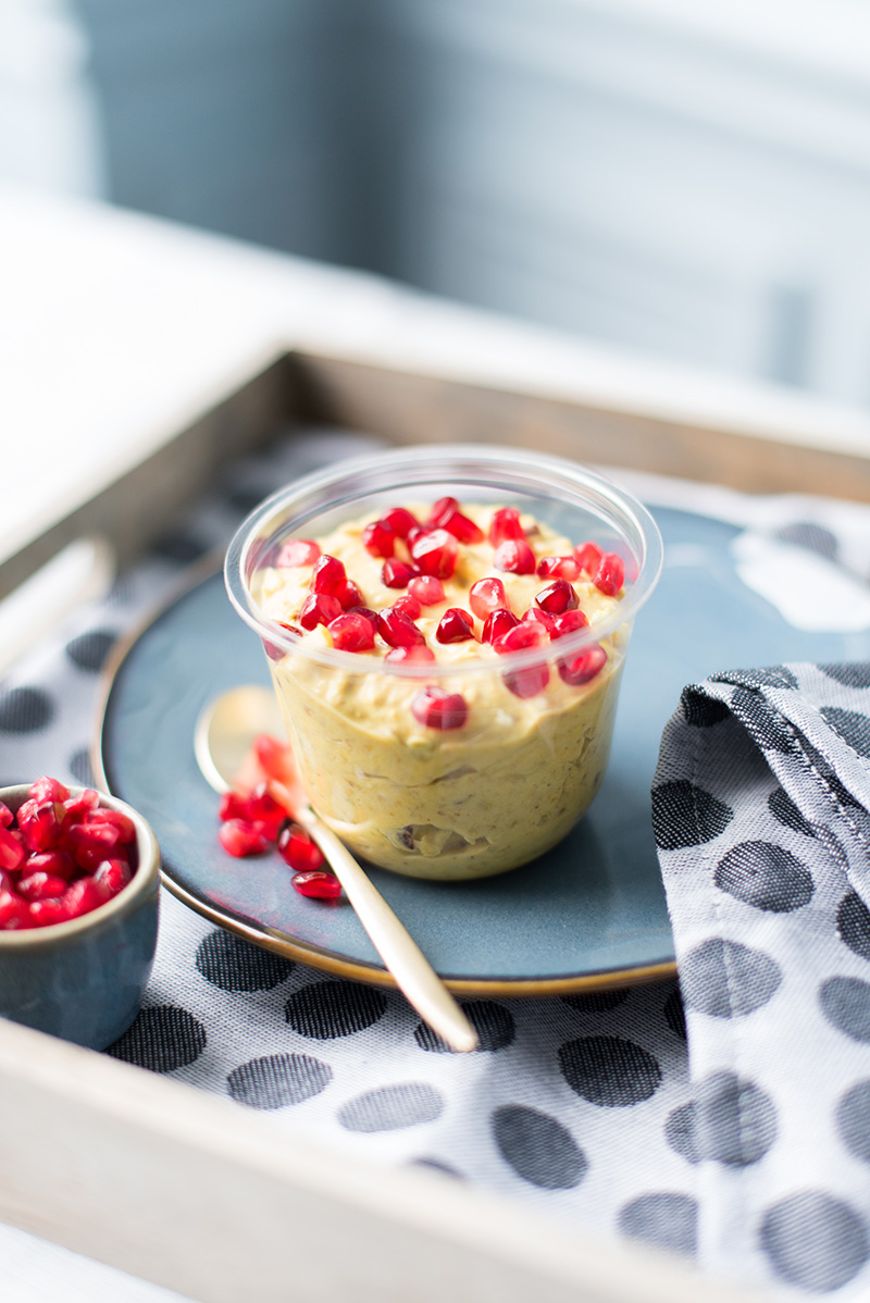 Dresser dans des assiettes creuses et décorer de graines de grenade.