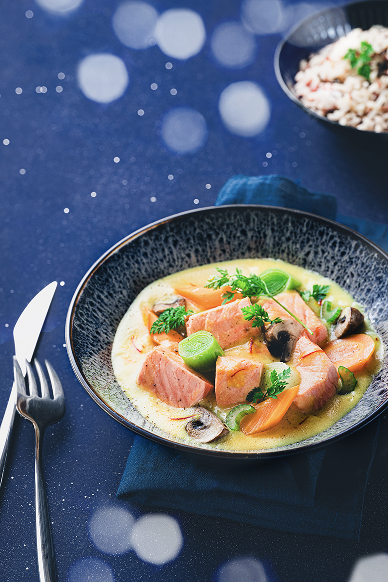 Cette recette est une alternative parfaite à la traditionnelle blanquette. Le raffinement du safran vient révéler et enjoliver le goût marin du saumon de Norvège dont la chair tendre et délicieuse, se marie parfaitement avec les saveurs de ce plat.