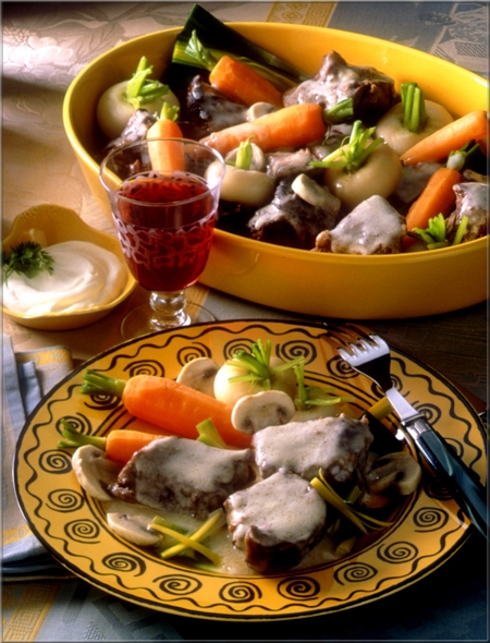 3• Faire revenir les légumes épluchés dans une sauteuse, avec le beurre. Ajouter la viande, saupoudrer de farine, laisser roussir et mouiller avec le bouillon. Assaisonner, ajouter l’oignon, le bouquet garni et laisser cuire 1 h 30 à 2 h 00 à feu doux.